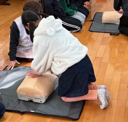 胸骨圧迫(心臓マッサージ)の手順を実際に行ないました。